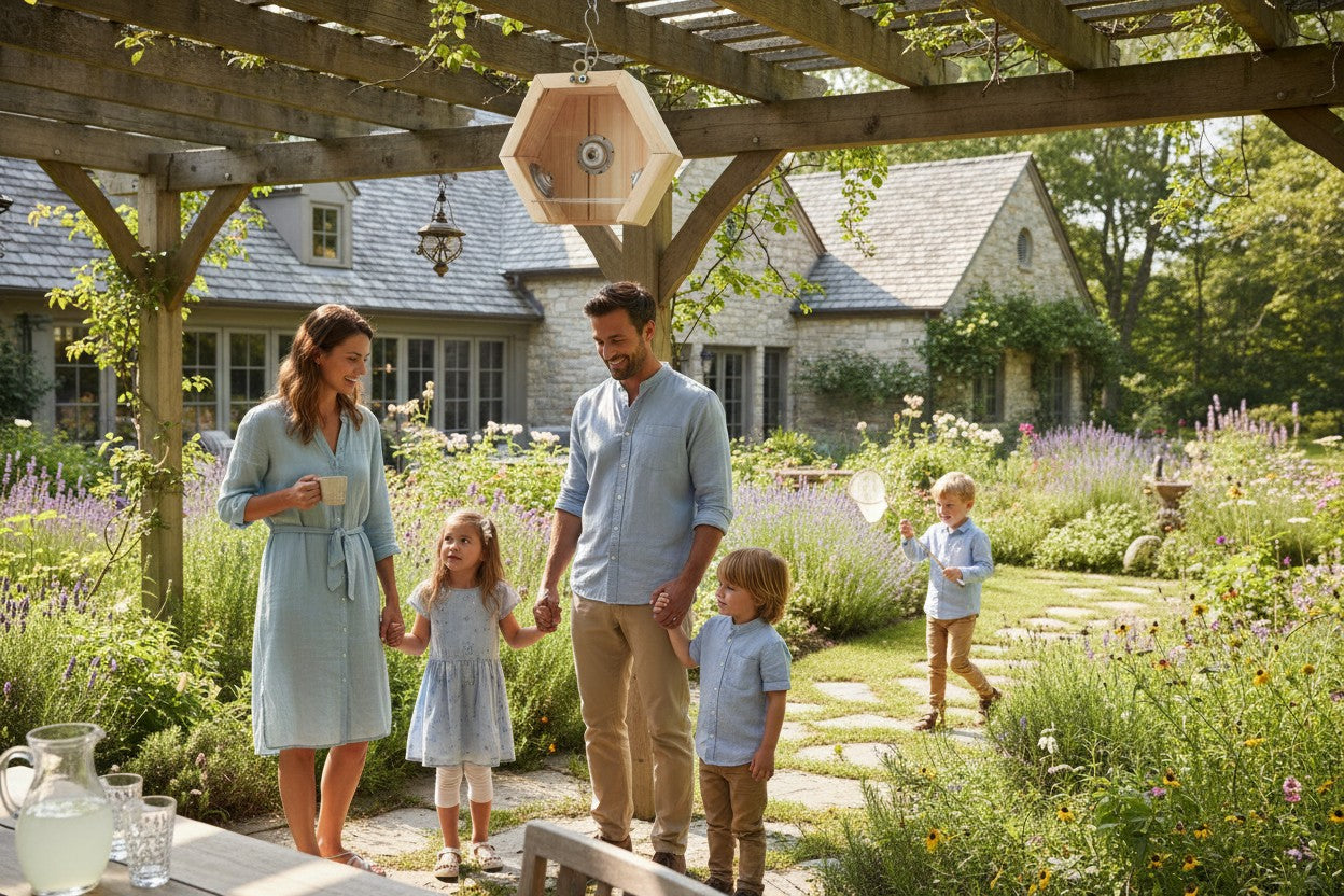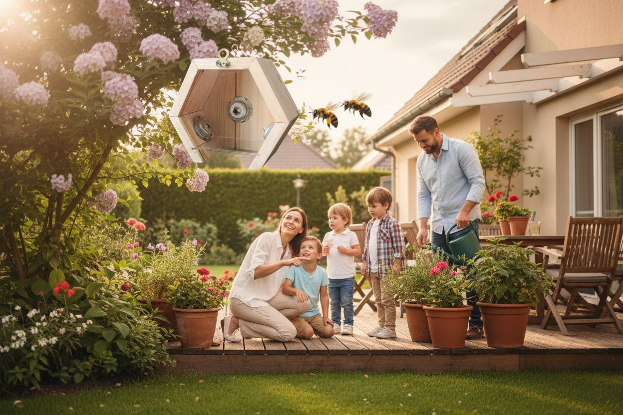Unlike bulky, traditional traps, our Hexagonal Design blends seamlessly into your home’s architecture as a decorative garden element. The combination of bee-preferred wood and the one-way entry system ensures your wooden structures remain hole-free without the use of harmful chemicals.